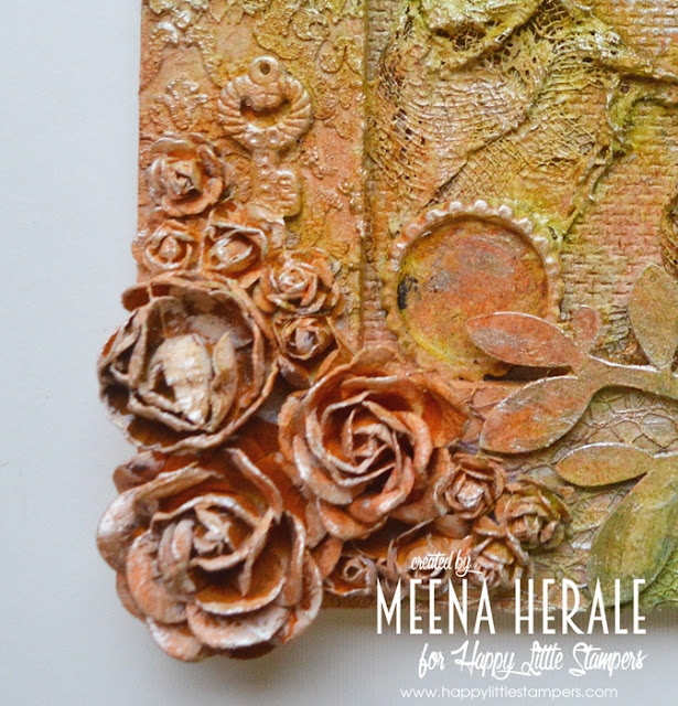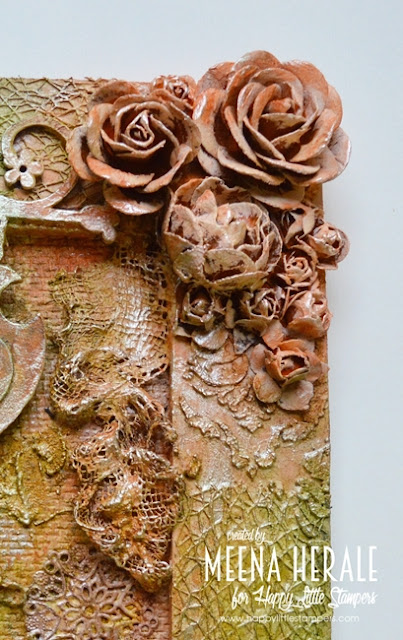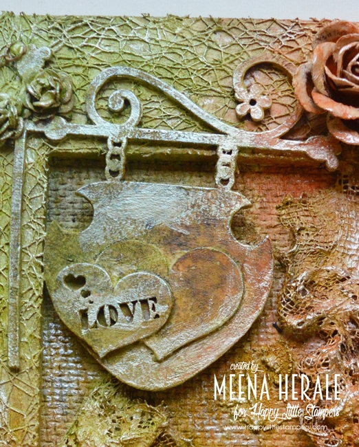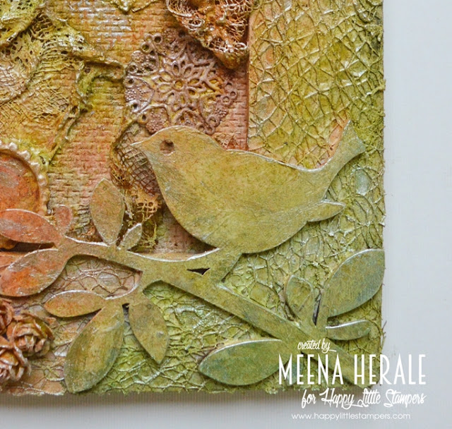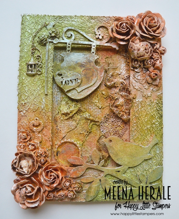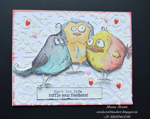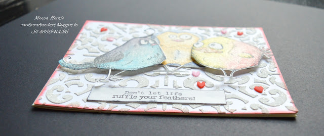 I have used MFT stencil and Ranger texture paste for background and sparkle Distress glitter on top of it when it was still wet. Stamped, coloured and die cut the Bird crazy birds. For colouring I used Zig brush and instead of water brush I used wink of Stella to blend the colours. Added tiny hearts from Dress My Craft.