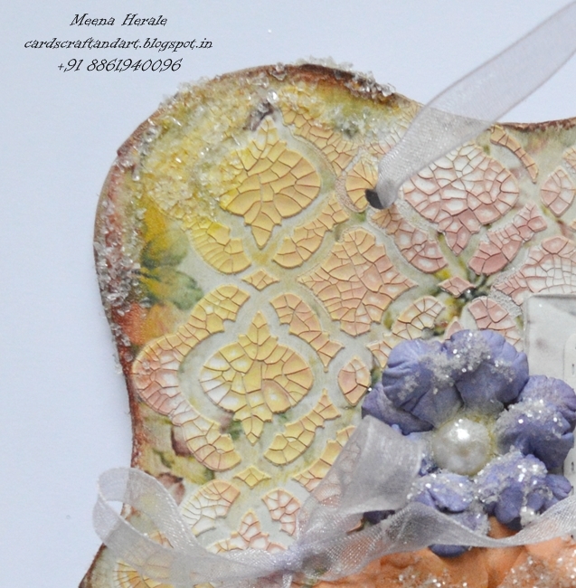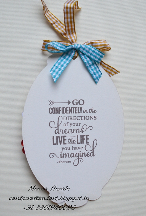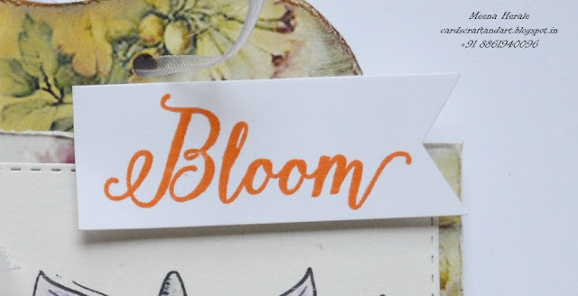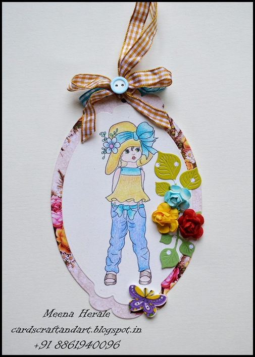 I took the print out of the digi image and coloured it with Faber-castell Polychromos. Next I die cut it using Spellbinders Nestabilites. I took a pattern paper and die cut it, next I adhere the coloured image on the PP tag. Added a bow and button on the bow. Added few flowers and leaves on the tag.