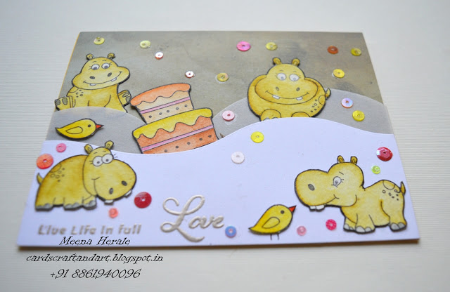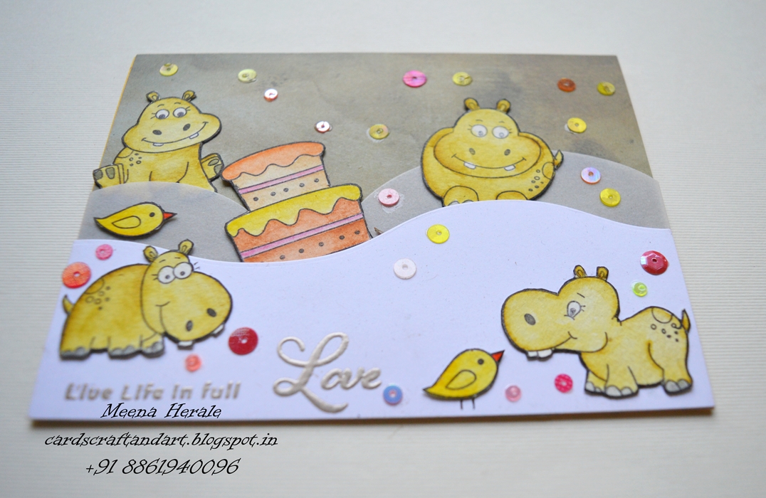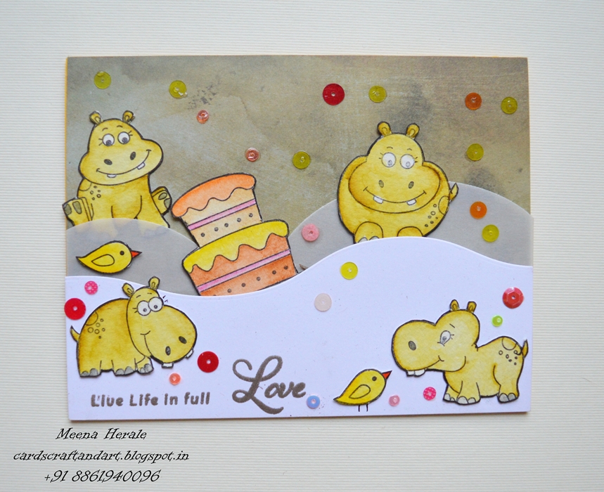 Next I adhere the hippos, birds and cake on the card and finished it with some sequins.
